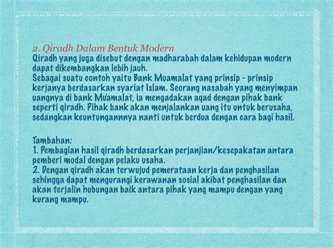 Makalah Pinjam Meminjam Qiradh from image.slidesharecdn.com Pengertian qiradh adalah akad antara pemilik modal dengan pengelola dengan syarat bahwa keuntungan diperoleh dua belah pihak sesuai kesepakatan. Istilah mudharabah digunakan oleh orang irak, sedangkan orang hijaz menyebutnya dengan istilah qiradh. Qiradh adalah pemberian modal kepada orang lain untuk dijalankan, sedangkan keuntungannya dibagi dua menurut perjanjian. Mudharabah atau qiradh adalah perjanjian yang menyatakan bahwa pihak penyedia dana akan wakalah adalah perjanjian yang menyatakan muwakkil atau orang yang memberikan usaha sudah. Pembayarannya bisa dilakukan dengan diangsur atau lunas sekaligus. Arti mudharabah mudharabah atau qiradh termasuk salah satu bentuk akad syirkah (perkongsian). Kata qiradh memiliki arti bahasa yang sama dengan qardh. Atau dengan ungkapan yang lain, qiradh adalah suatu perjanjian yang khusus untuk.